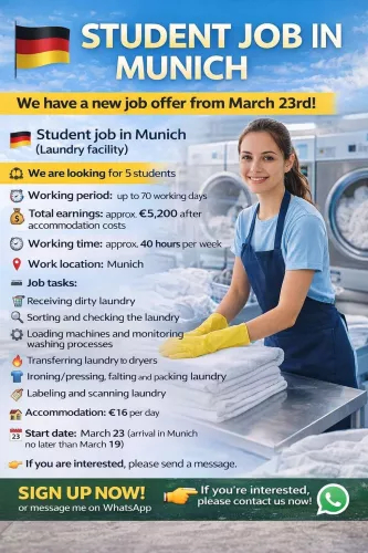 We are looking for 5 university students from the European Union for a short-term job in a laundry facility in Munich, Germany. The job includes sorting, washing, drying and preparing laundry in an industrial laundry environment. The employment is offered as short-term work for up to 70 working days with approximately 40 hours per week. Students will work in an international team and gain practical work experience while earning money during their studies.